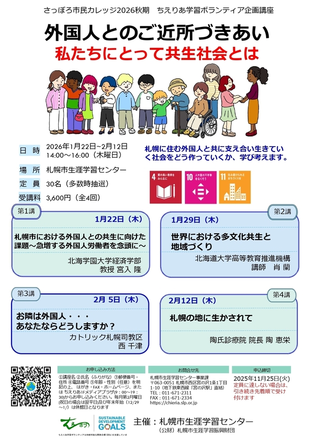 少子高齢化が進むわが国において、高齢者介護などさまざまな社会分野で、私たちの生活を支える外国人住民が急速に増えています。札幌においても同様です。いろいろな文化をもつ外国人住民は、多様性に富んだ新たな活力を私たちに提供してくれます。一方で、言語や文化の違いによる誤解、制度的な支援の不足、地域社会との距離感など、課題を多く抱えているのも現実です。