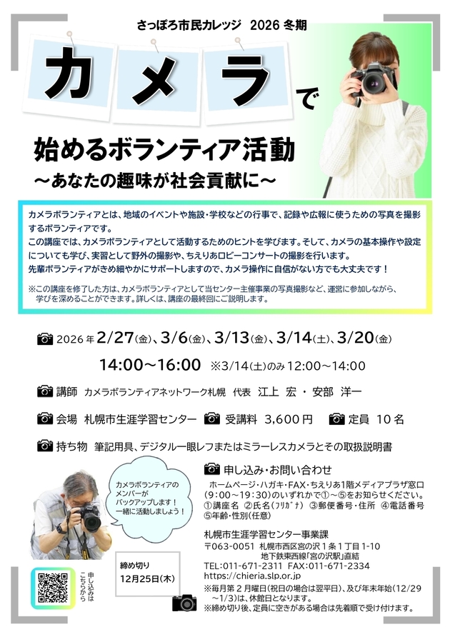 ※この講座を修了した方は、カメラボランティアとして当センター主催事業の写真撮影など運営に参加しながら学びを深めることができます。詳しくは講座の最終回にご説明します。